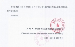 本項(xiàng)目截止2021年2月18日17時(shí)00分前,繳納投標(biāo)保證金家數(shù)未滿三家,故作流標(biāo)處理。特此通知!采購(gòu)人:雅安市名山區(qū)茶城建設(shè)工程有限公司采購(gòu)招標(biāo)代理機(jī)構(gòu):四川省中遂建設(shè)項(xiàng)目管理有限公司日期:2021年2月20日...