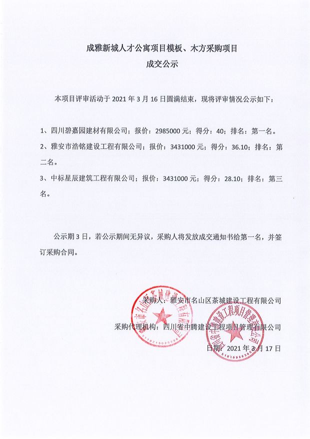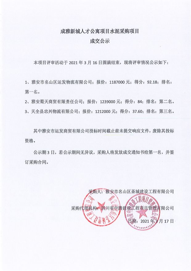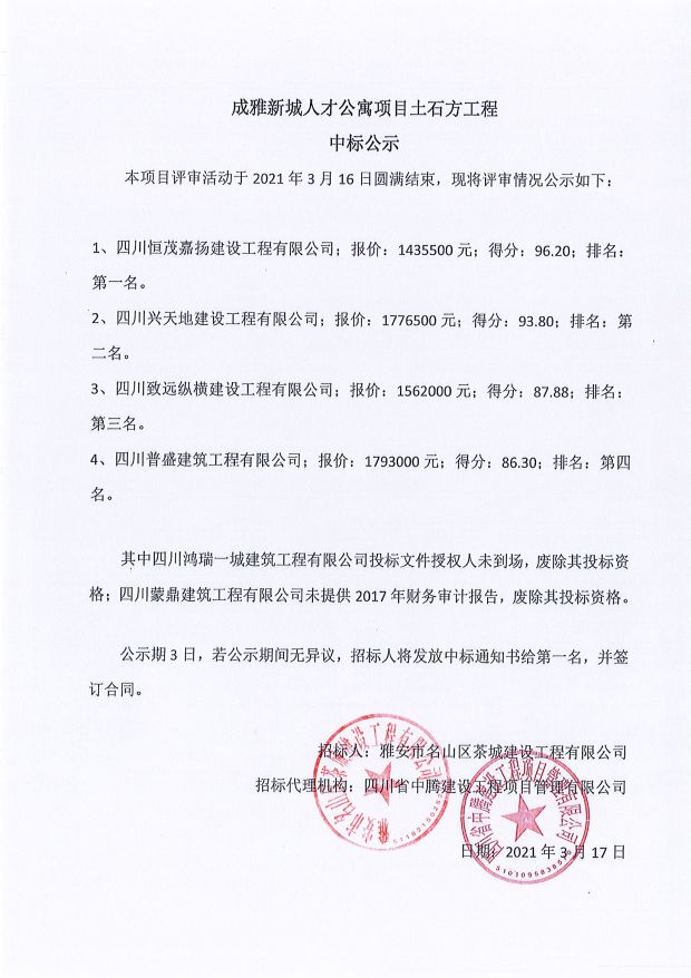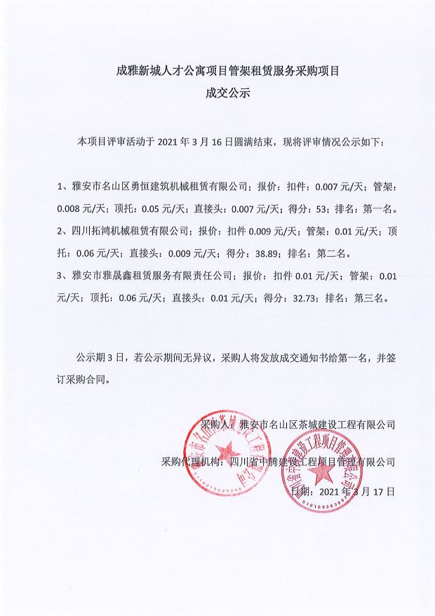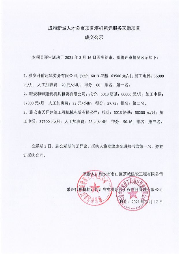 成雅新城人才公寓砂石、塔機(jī)租賃、土石方、鋼材、管架租賃、模板木方、水泥采購(gòu)項(xiàng)目成交公示