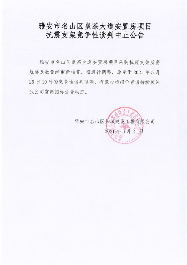雅安市名山區(qū)皇茶大道安置房項目抗震支架競爭性談判中止公告